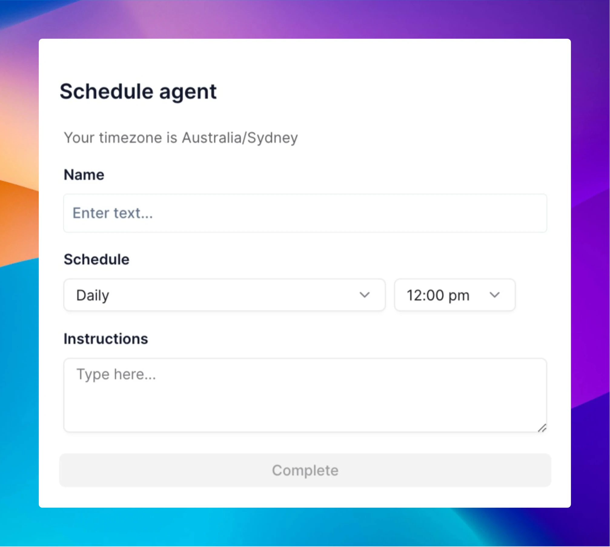 Scheduled runs use your account’s configured timezone. You can adjust this in your agent’s schedule settings to ensure tasks run at the correct local time.